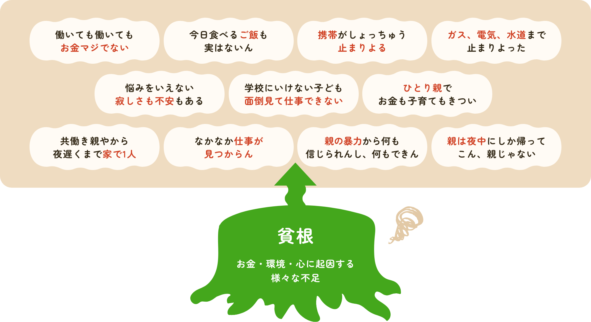 そんなしんどい状況には「貧困(=経済的な貧しさ)」だけじゃなく、「貧根」が根本の原因にあると考えています。その人がこれまでの人生で積み重ねてきた愛情不足、時間の不足など、お金・環境・心に起因する様々な不足が根っこのように複雑に絡まって、自分の力では解くことも難しい、そんな人たちをたくさん見てきました。
