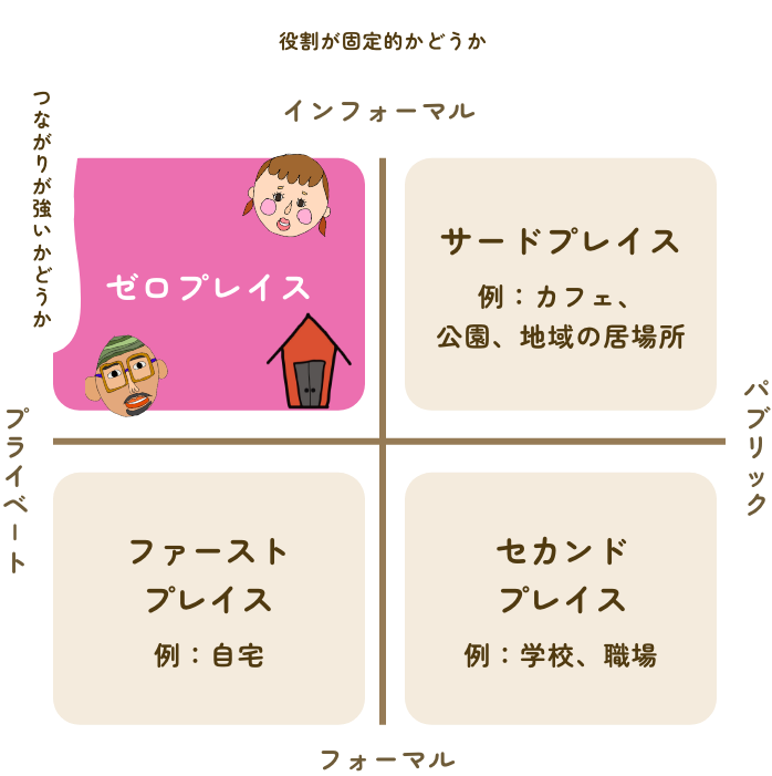 固定的な役割のないサードプレイスと呼ばれる場所では、地域の人とゆるやかにつながることができても、自分をさらけだせるほどのつながりをつくるのは難しい。ゼロプレイスには、他人ではなく本気の愛でつながりあう、強いつながりがあります。